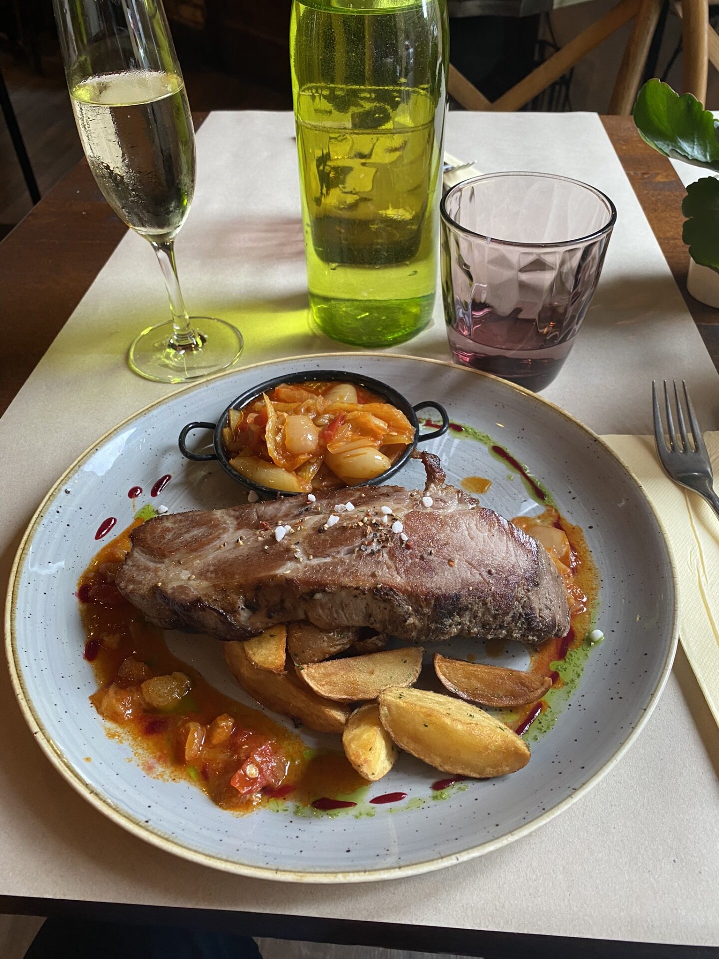 注文したのは、マンガリッツァ豚のステーキ。 皿の上には、トマトベースの赤いソースがたっぷりとかかった分厚い豚肉。ナイフを入れると、驚くほど柔らかく、断面からはじんわりと脂が滲み出す。 ひと口食べると、脂の甘みと赤身の旨みが同時に押し寄せてくる。豚肉とは思えないほどジューシーで、ソースの酸味がその濃厚さを絶妙に引き締めてくれる。
