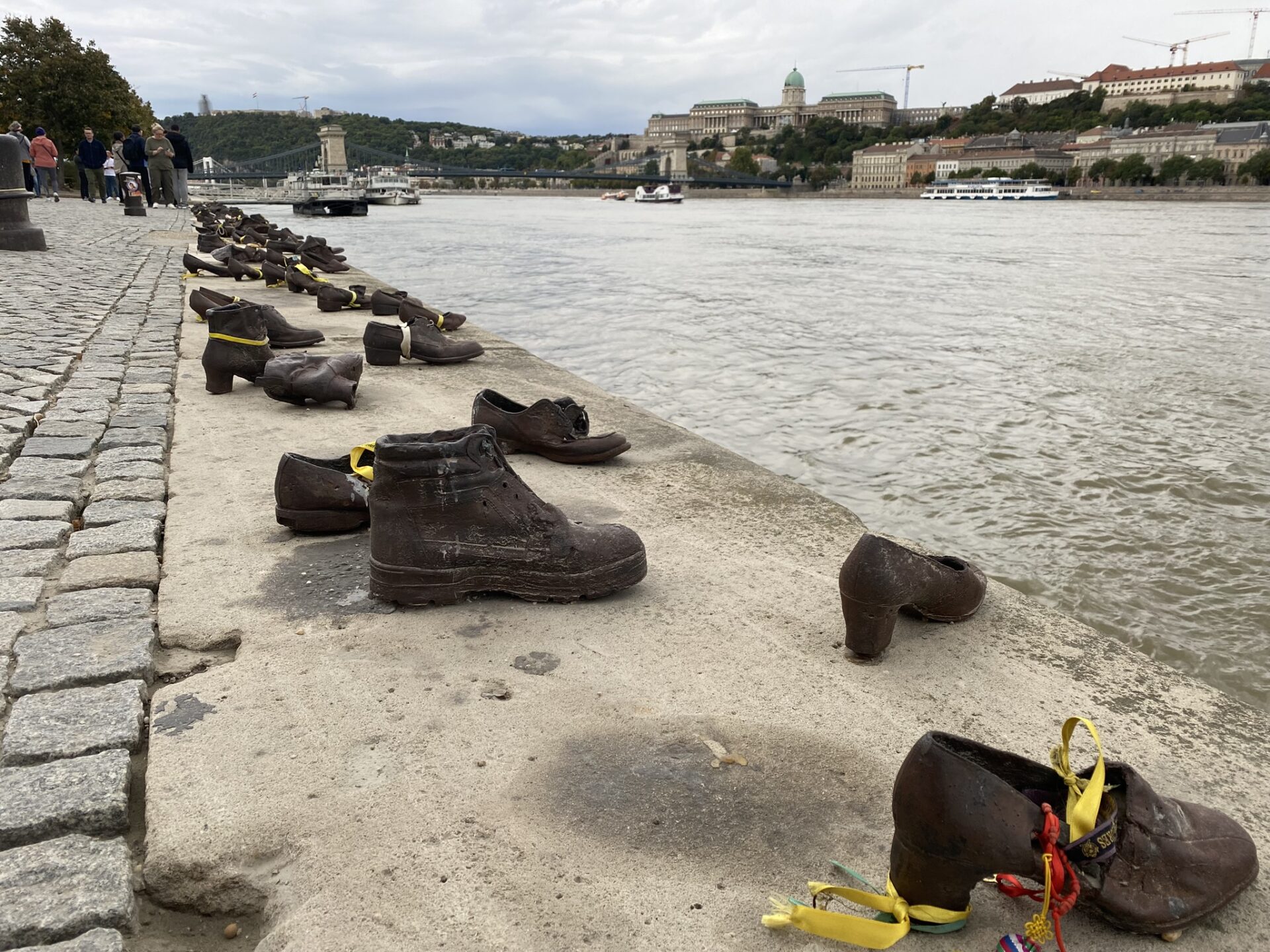 第二次世界大戦中、ホロコーストによってユダヤ人がこの場所で処刑された悲しい歴史を記憶するモニュメント。靴は当時貴重品であったため脱がされたとのこと。子供の靴もあるのが胸を苦しめる。