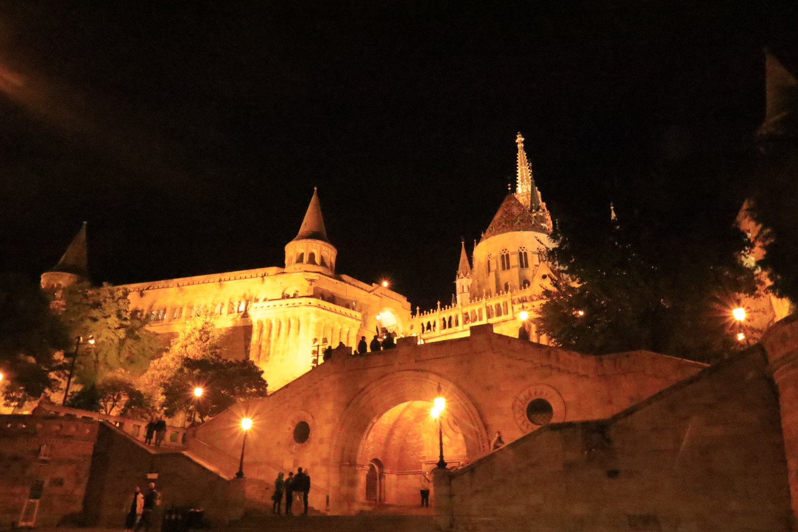 昨晩は温泉の後に気力がわかず夜景を見られなかったが、ドナウの真珠とも評されるブダペストの夜景を見ずに旅を終えることなど許されない。ということで、真っ暗の中、温泉で濡れたタオルを乾かしながら昨日も訪れた漁夫の砦へ向かう。