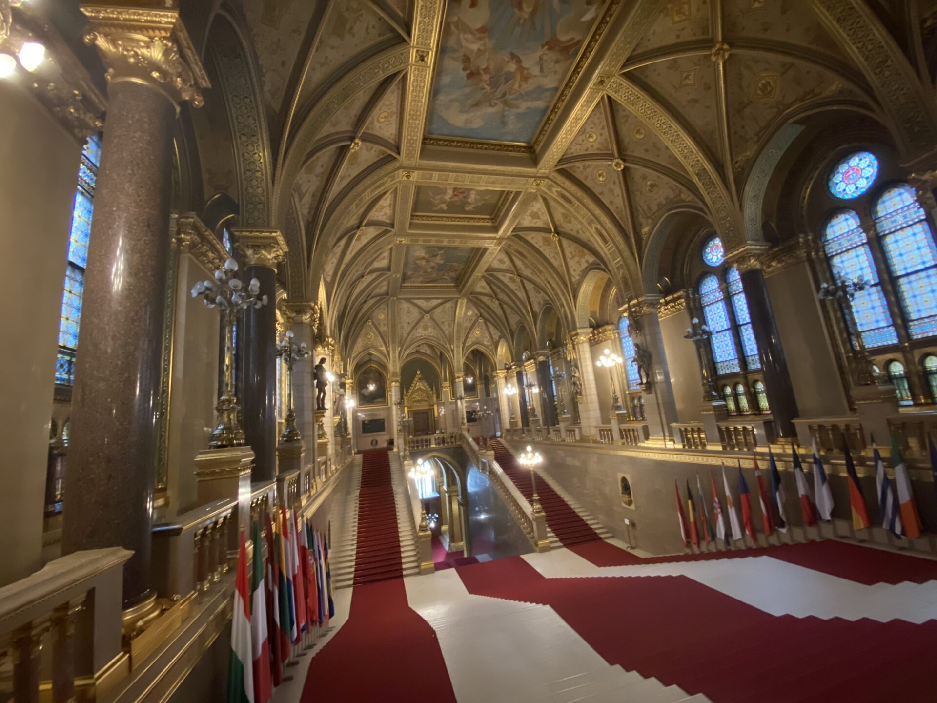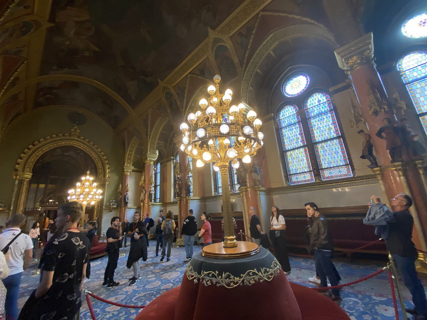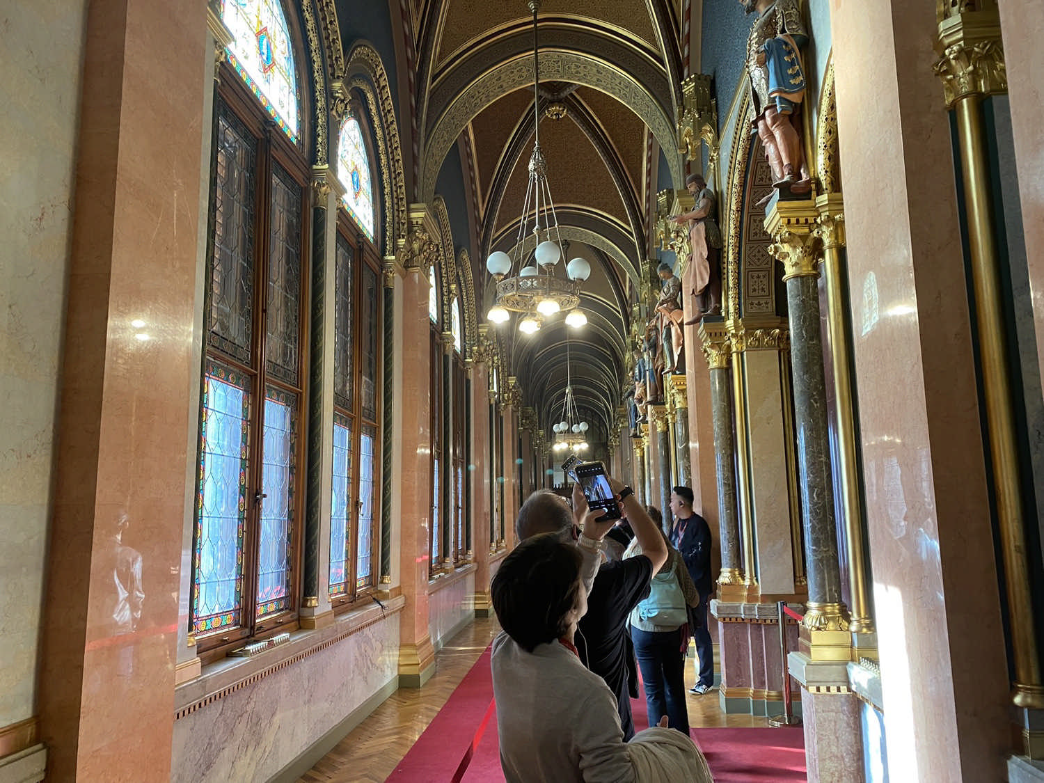 内部見学は予約必須。入り口は地下のような場所にあり、少しわかりにくい。日本語ガイドを受け取ってツアー開始。王冠の間では、ハンガリー初代国王・聖イシュトヴァーンの王冠が展示されているが、衛兵が立っていて写真撮影は不可。ステンドグラスが美しく、窓からはドナウ川がすぐそこに見える立地も秀逸。内部はとにかく金箔がふんだんに装飾に用いられており、ぴかぴかで目がくらみそうになった