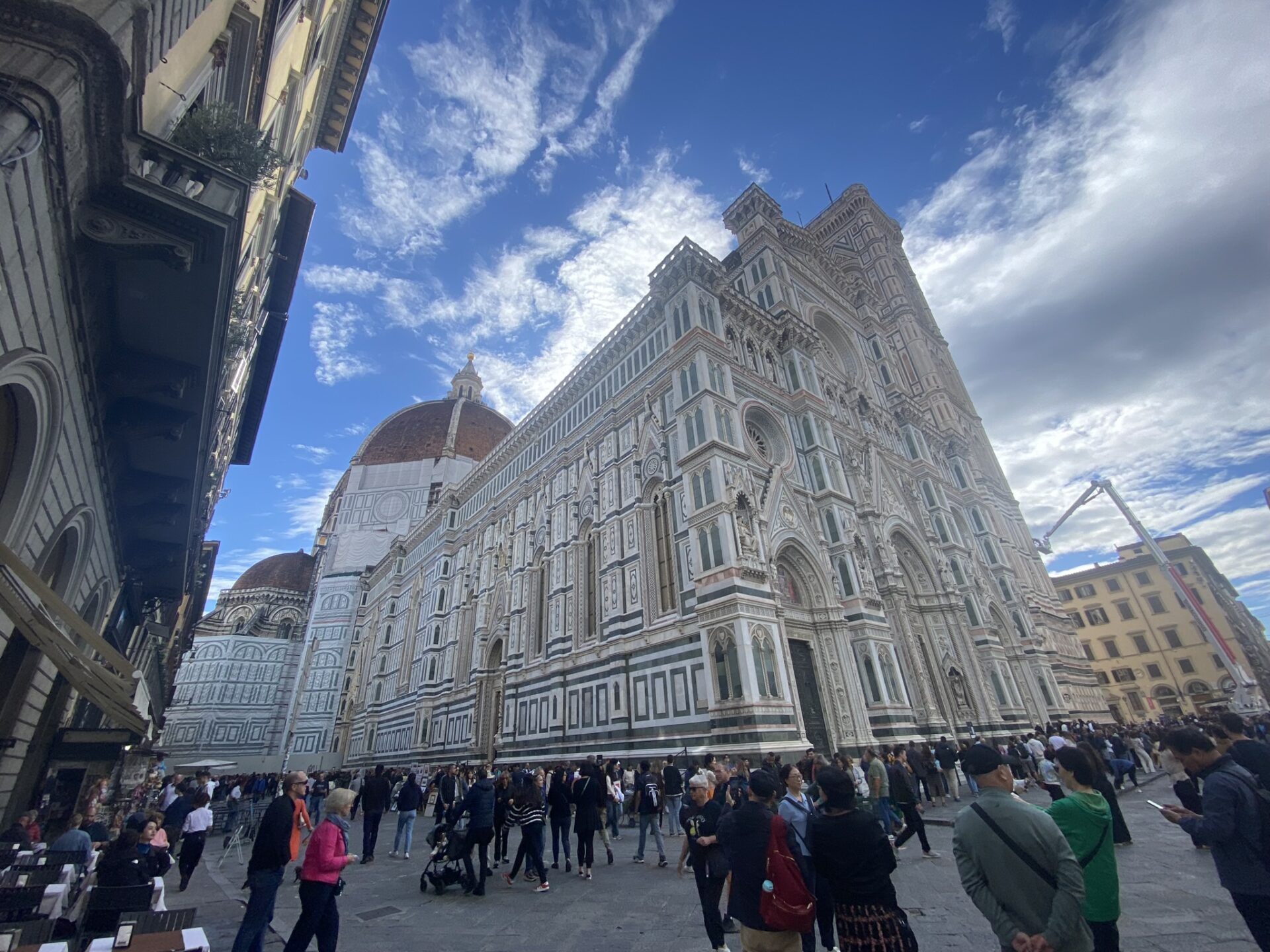 フィレンツェの旧市街は、ユネスコ世界遺産にも登録されている歴史的都市景観。ローマ同様に観光客で混雑しているが、建物の装飾はより繊細で、街全体に統一感がある。石畳の道を歩きながら、サンタ・マリア・デル・フィオーレ大聖堂のある広場に差し掛かると、目の前に現れる巨大なドームと大理石のファサードに圧倒される。