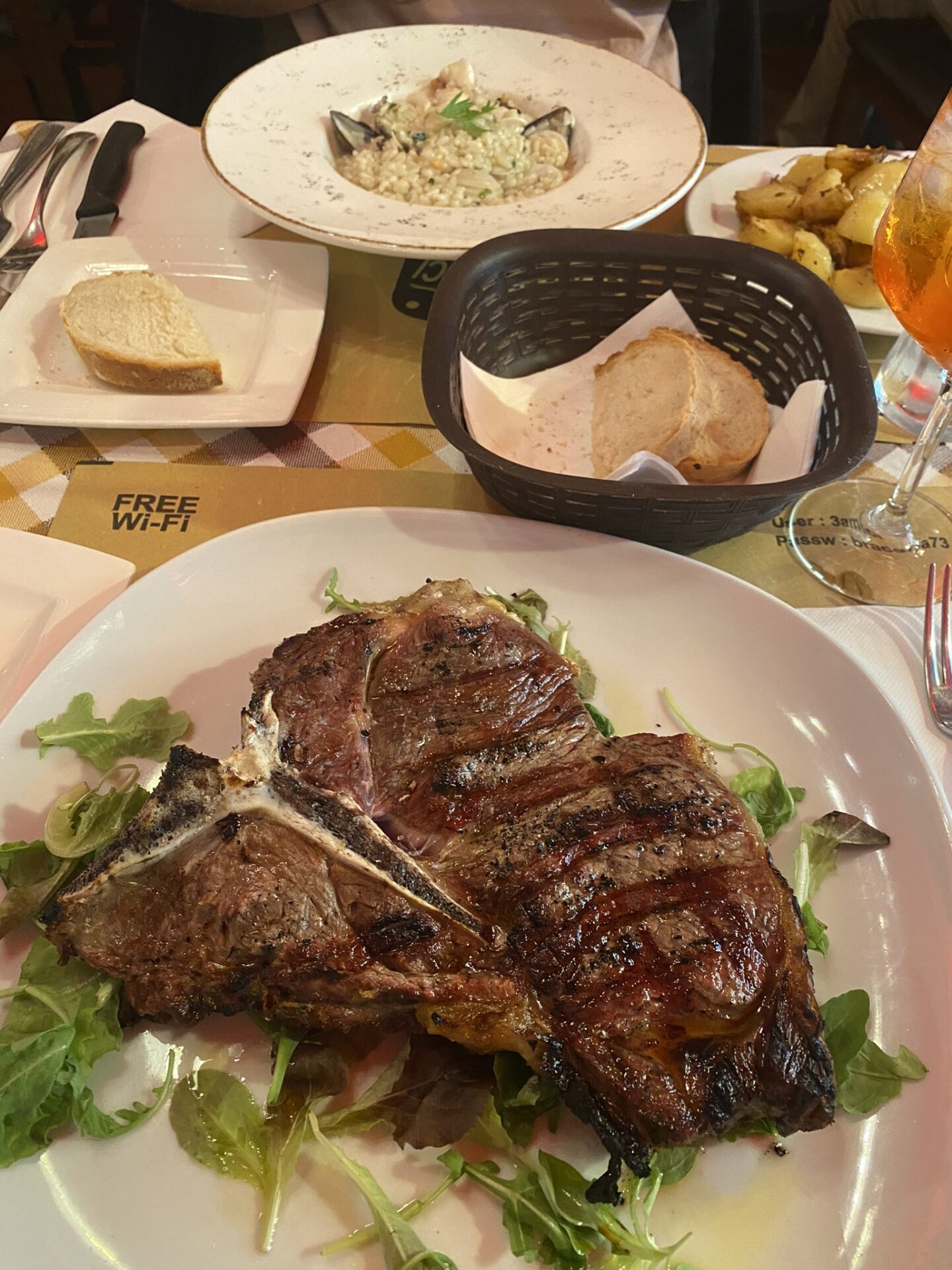 食事は全体的に美味しく、良い店にも出会えた。フィレンツェ名物の牛肉料理は有名だが、個人的には和牛の方が好み。イタリアでは基本的にチップは不要で、代わりに席料として1人あたり約2€が加算されるスタイルが一般的。