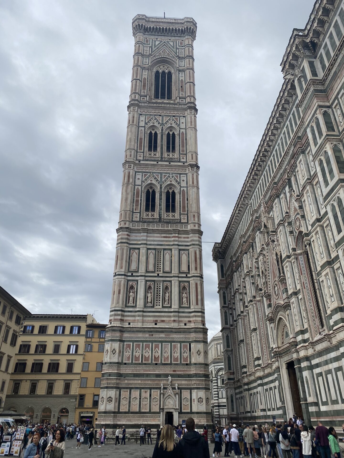 ドゥオモに隣接する高さ約85mの鐘楼。14世紀に建てられ、ドゥオモ越しの街並みを撮影する定番スポット。時間ごとに入場人数が制限されており、15:30の枠で先頭入場。ドゥオモのチケットを買うとこちらにも入場可能。