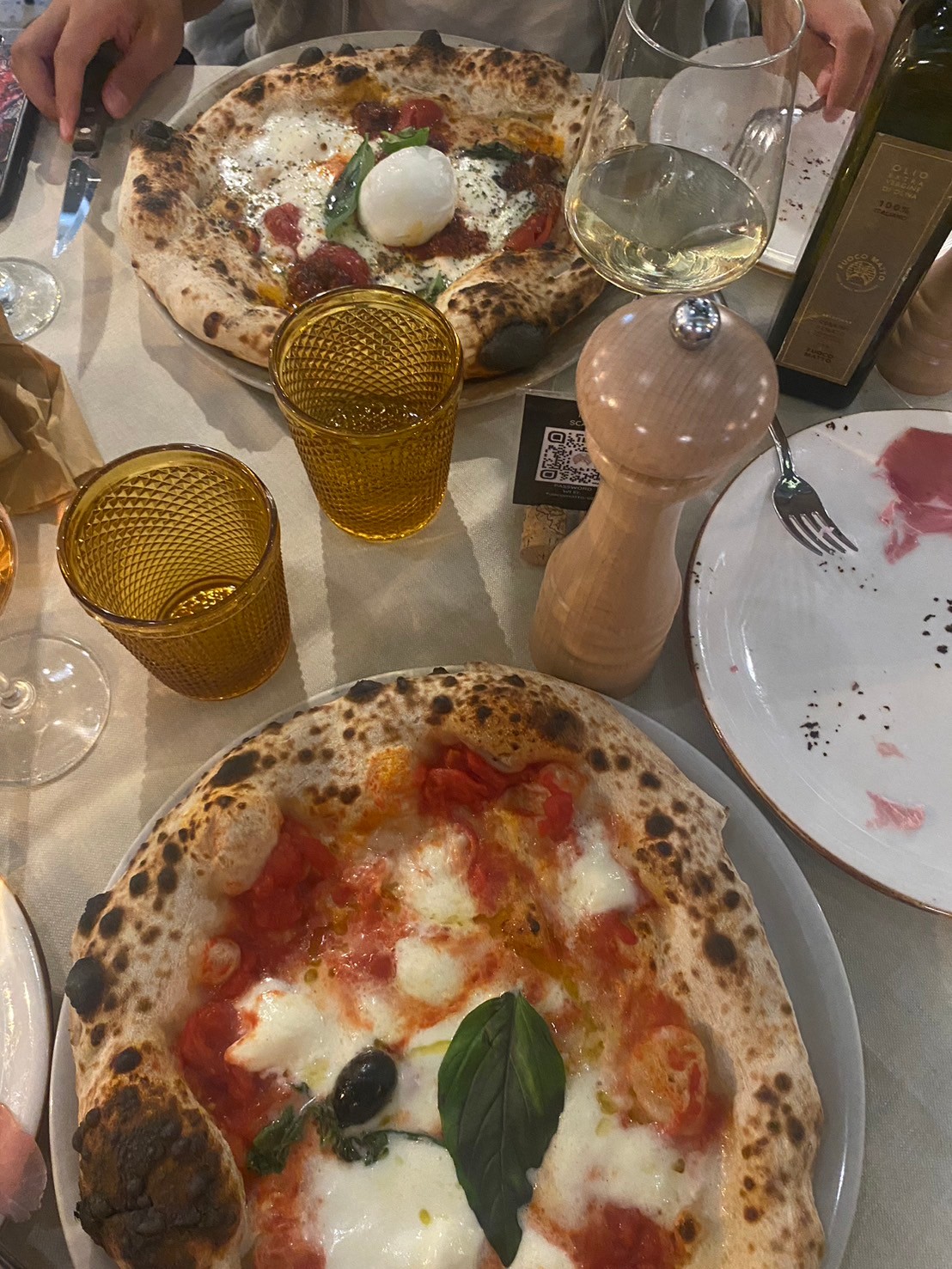 開店前から並んで入店。旅行全体を通してもトップレベルの味と雰囲気の店。ウェルカムシャンパンのサービスもあり、プロシュートとブラータチーズのスパイシーピザ、マルゲリータを注文。