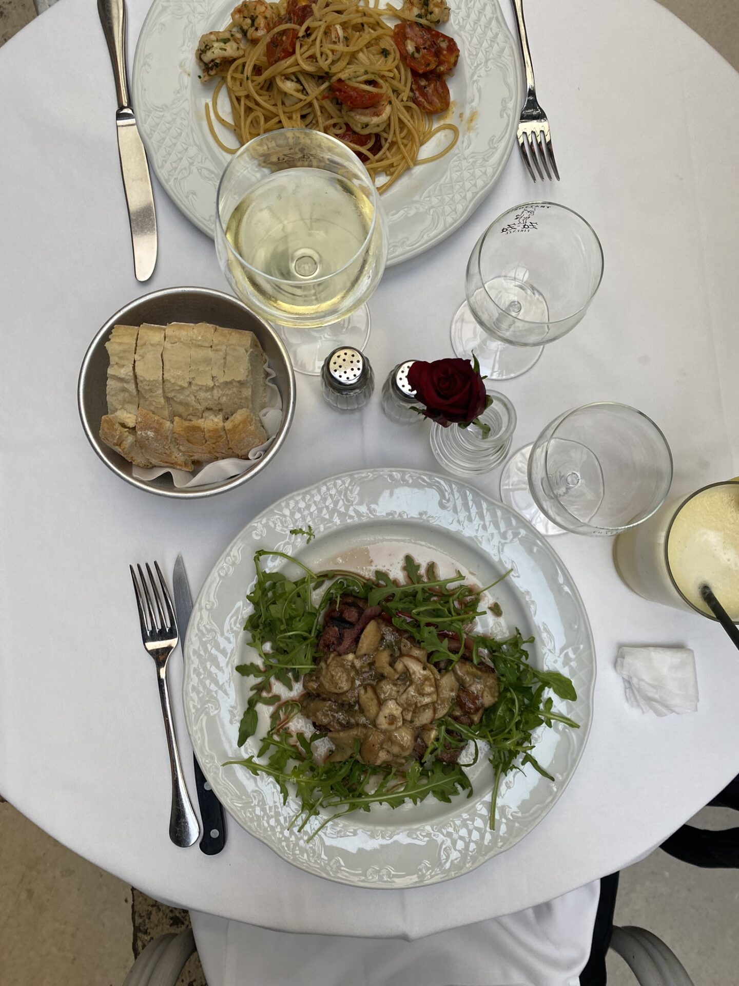 注文したのはキノコソースのタリアータとエビとトマトのパスタ。柔らかくてソースとの相性も良好。牛肉リベンジとして注文したタリアータは柔らかくてソースとの相性も良好。ただし、日本の和牛には及ばないという印象。どちらの料理も日本人好みでおいしいのだが、逆に新鮮味がなく、旅先の食事としてはもっととがったものを食べたかったなという気持ちもあった。