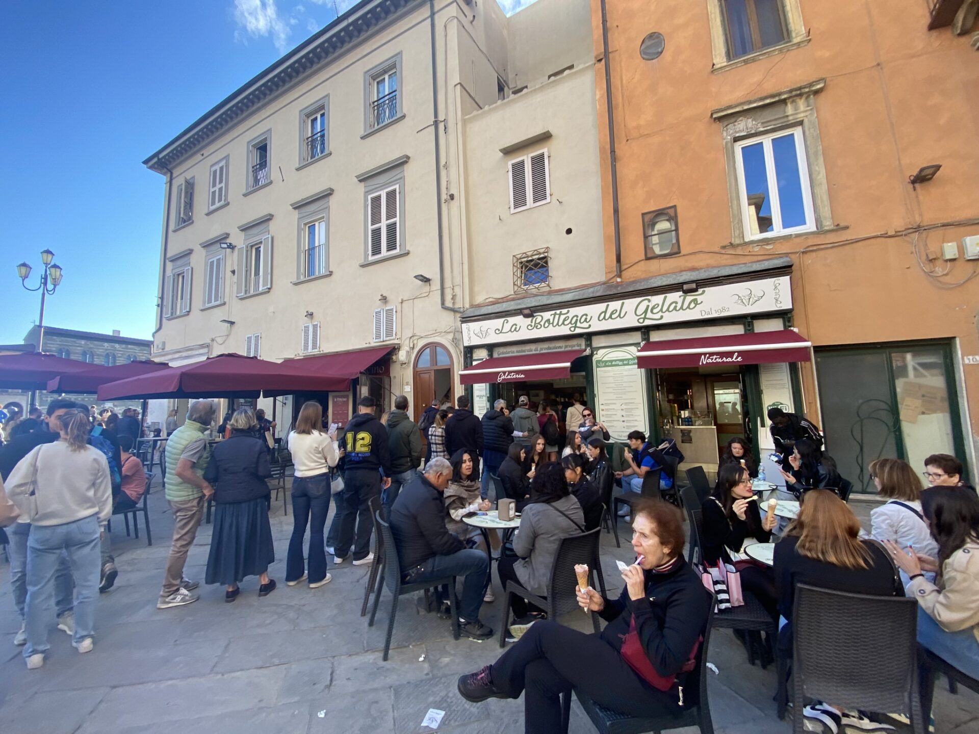 傾いている様子を写真に収めるのは意外と難しく、構図に工夫が必要。街並みは少し田舎のヨーロッパという感じで、駅からメインロードが続いている構造がバーリに似ている印象。ローマやフィレンツェのような観光過密都市から来た身としては、少し落ち着いた気持ちになれる。