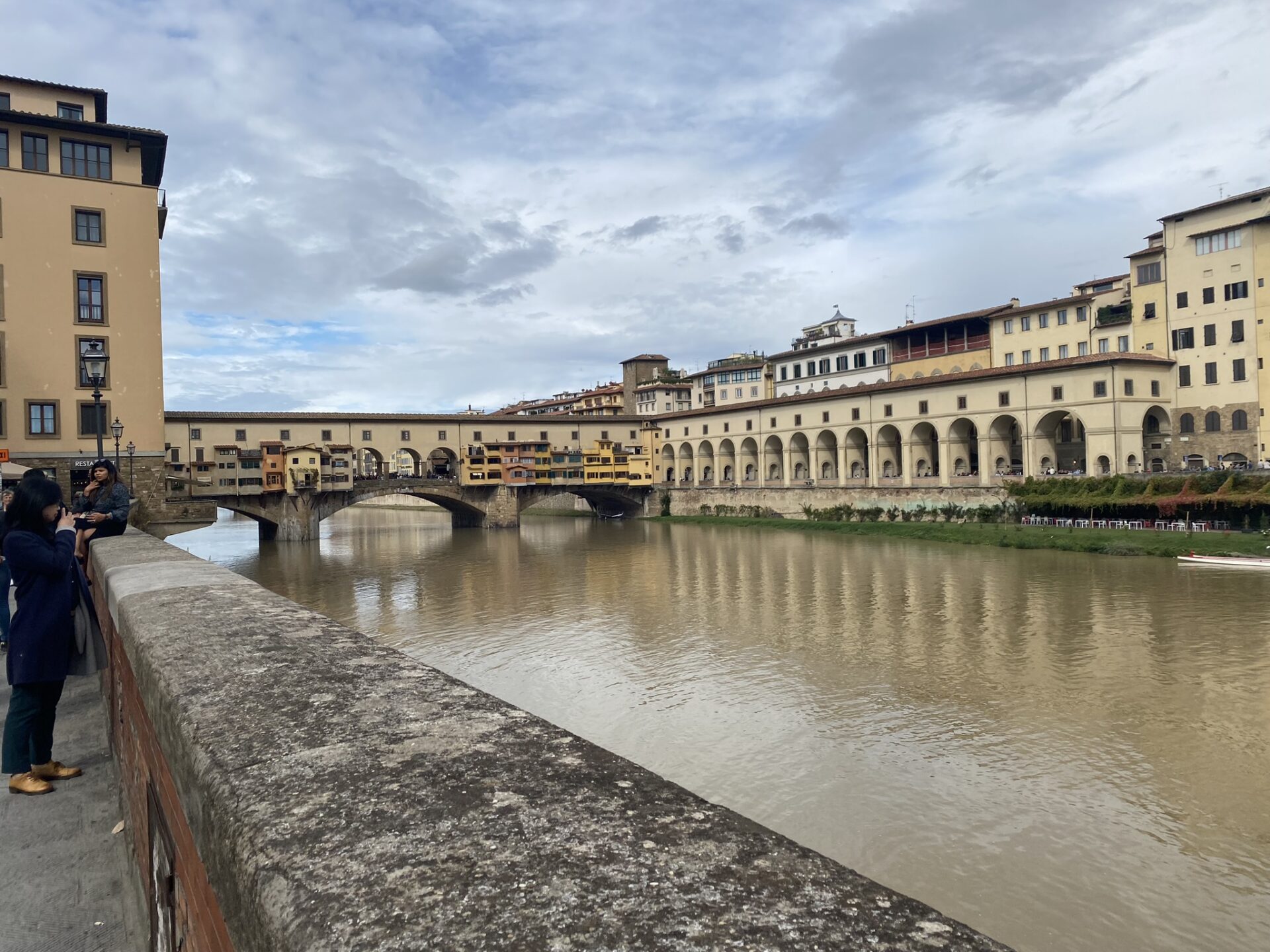 ヴェッキオ橋(Ponte Vecchio)は、フィレンツェを流れるアルノ川に架かる最古の橋で、14世紀に再建された石造のアーチ橋。特徴的は、橋の上に宝石店や金細工店が並ぶ商店街のような構造で、これは中世から続く伝統。こちらをとおりつつ、大聖堂へと急ぐ。