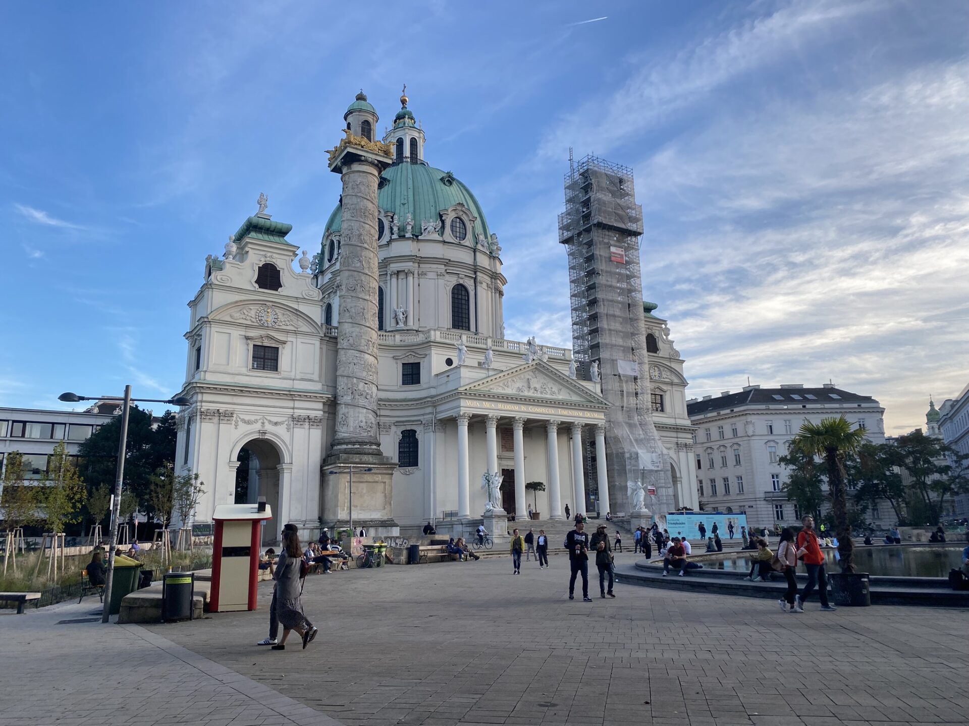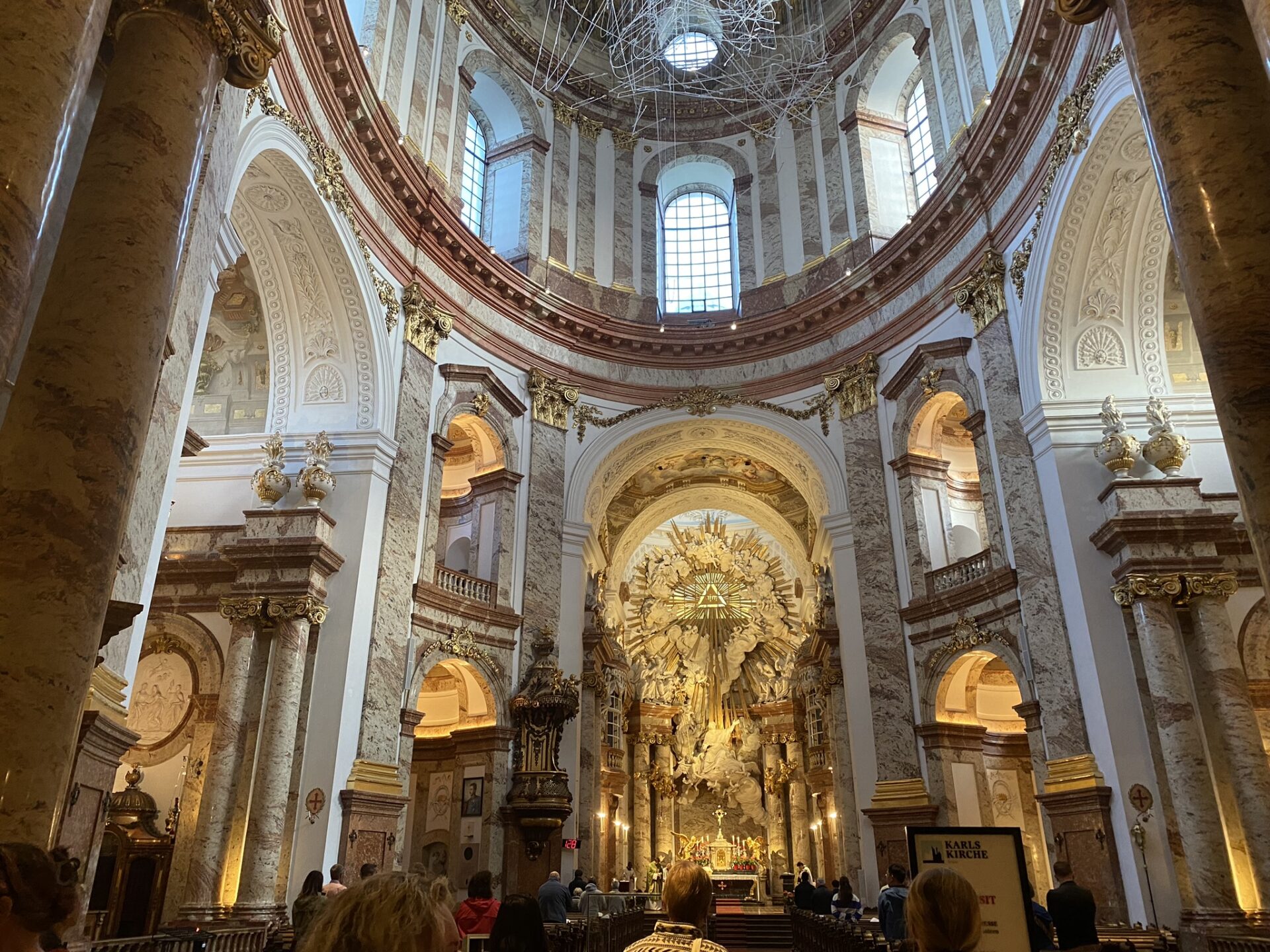 ウィーン南側に位置するバロック様式の教会。18世紀初頭、ペスト終息を祈願して神聖ローマ皇帝カール6世が建設を命じた。大きなドームと2本の柱が特徴的で、池に映る姿が美しい。内部にはエレベーターで天井画の近くまで登れる仕掛けもある。