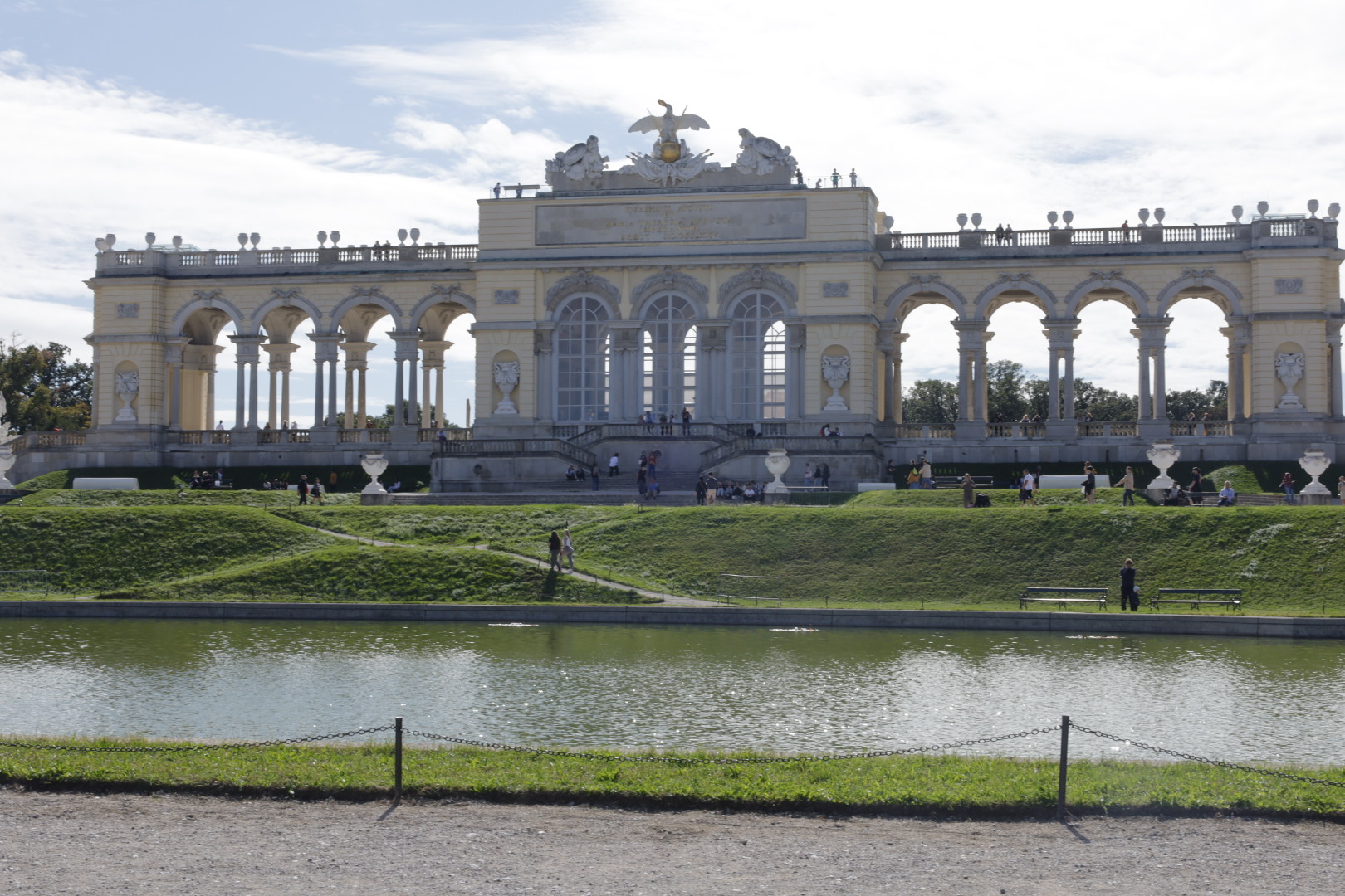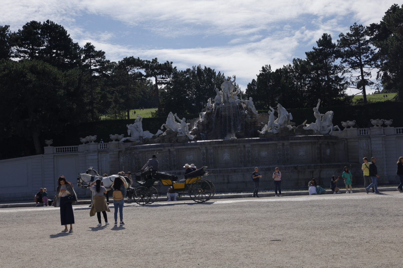 グロリエッテ自体に登るには別途料金がかかるため、今回は外観のみ。丘の上からは、宮殿とその奥に広がるウィーンの街並みが一望でき、景色は素晴らしかった。途中の噴水は裏側に入ることもでき、彫刻の装飾が凝っていて技術の高さを感じさせた。