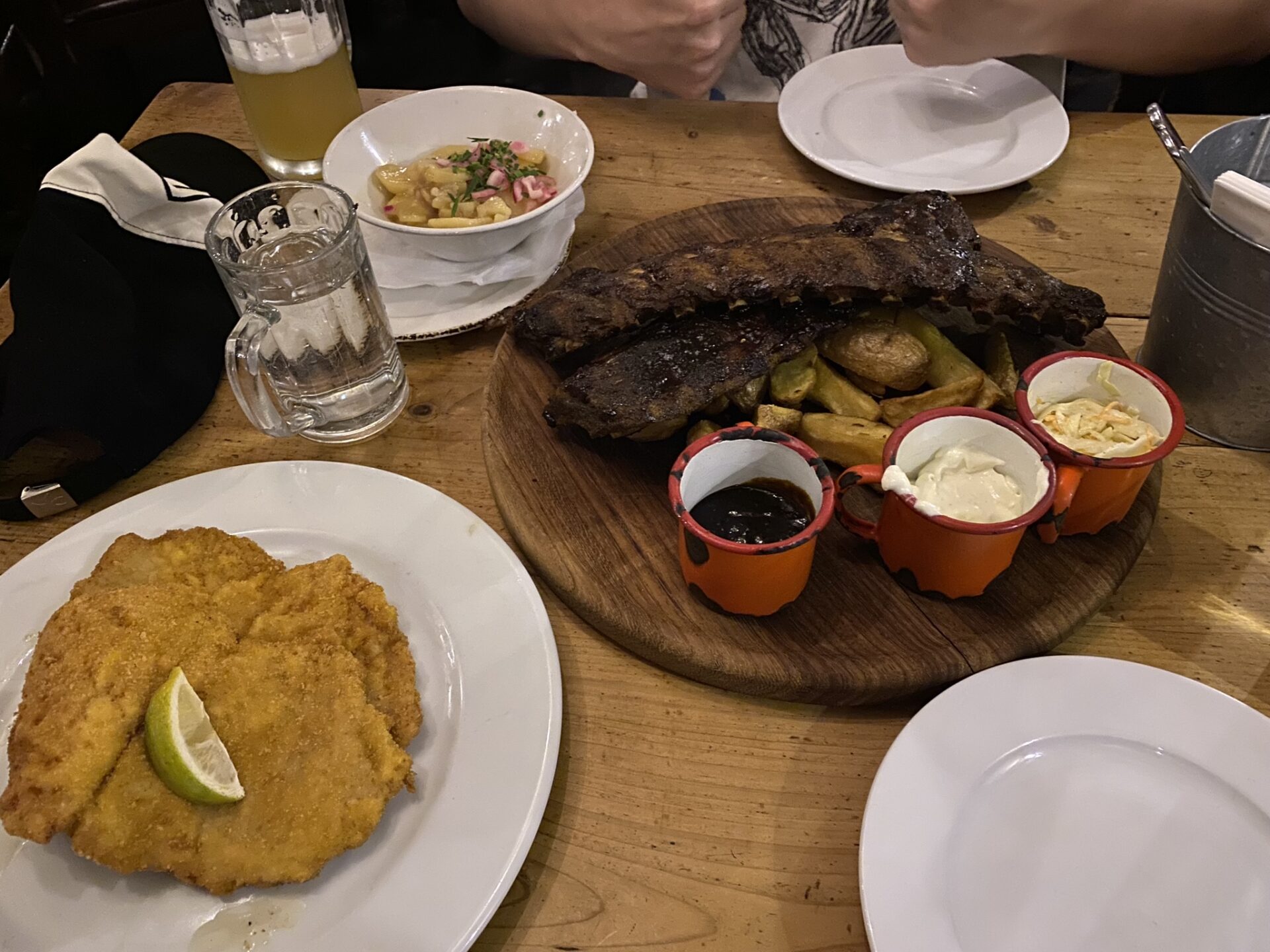 注文したのは、オーストリア名物のシュニッツェルとステーキ。シュニッツェルは薄く叩いた肉をカリッと揚げたもので、レモンを絞って食べるとさっぱりする。おいしいのだけど、日本のとんかつソースが欲しくなる味。ステーキはジューシーで、疲れた体に染み渡るようだった。オペラの話や旅の話をしながら、異国の夜を共有する時間は、旅ならではの特別なひとときだった。