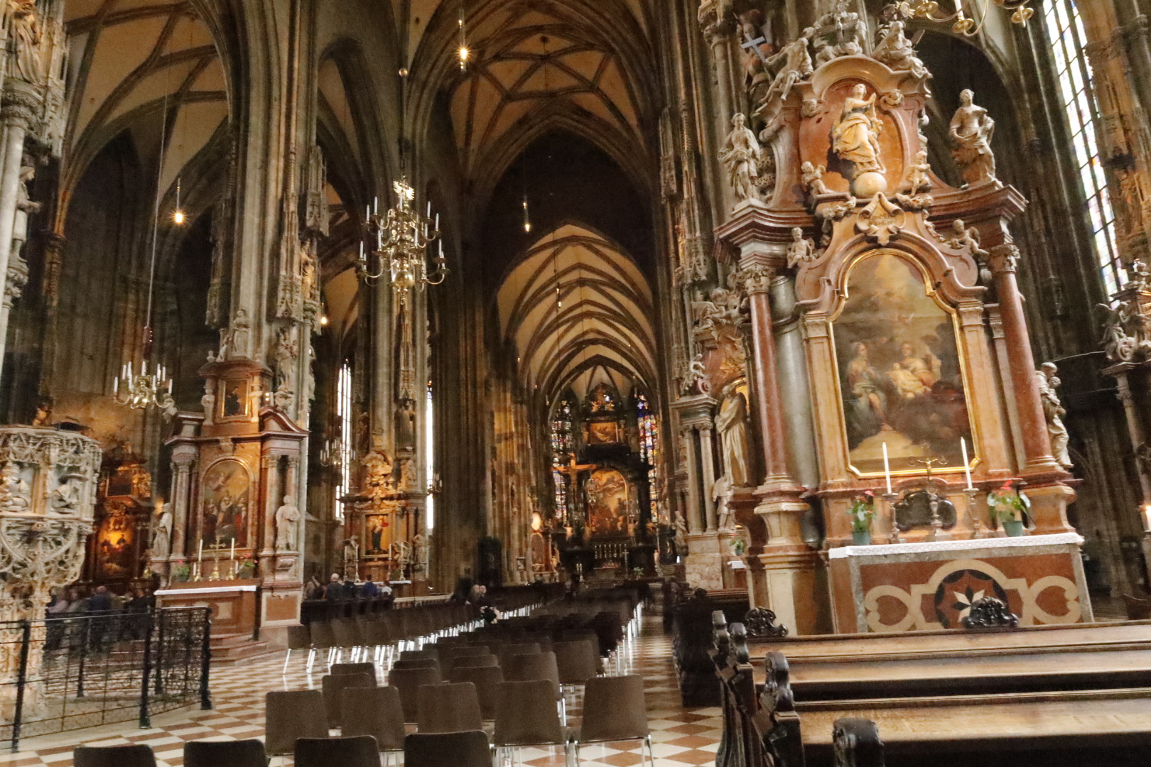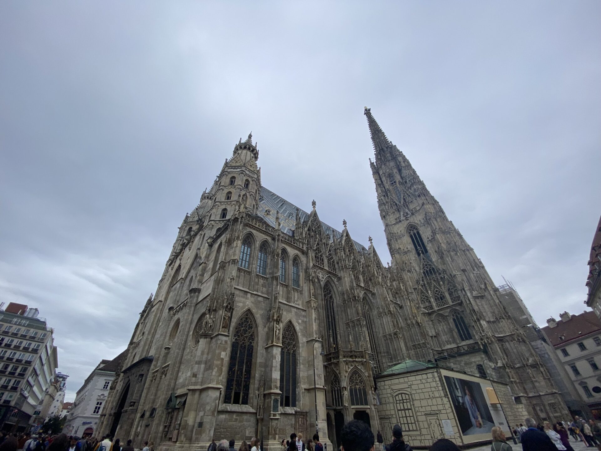 ウィーンの象徴とも言えるシュテファン大聖堂は、ゴシック様式の荘厳な建築で、外観はかなりいかつい。尖塔やファサードの装飾も細かく、写真映えするスポット。