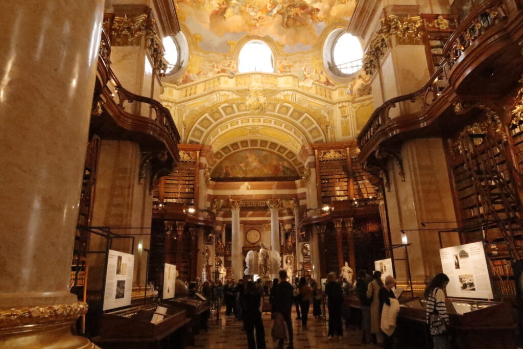 「世界一美しい図書館」とも称されるこの図書館は、バロック様式の壮麗な空間。プラハでも図書館を見たばかりだったため、少しためらったものの、やはり入ってみることに。天井画は見事で、天井も高く、まるでハリーポッターの映画に出てくるような幻想的な雰囲気。遠目で眺めるだけでなく、実際に中に入れるのがうれしい。